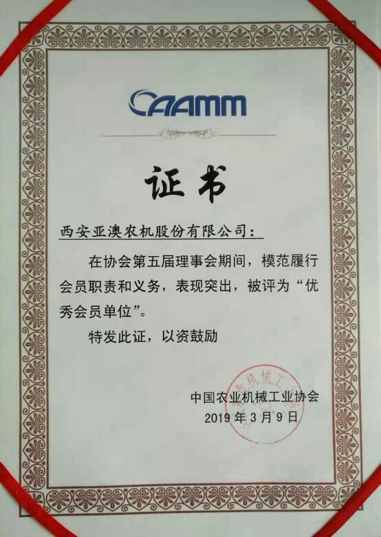 亞澳農機榮獲中國農機工業(yè)協(xié)會“優(yōu)秀會員單位”