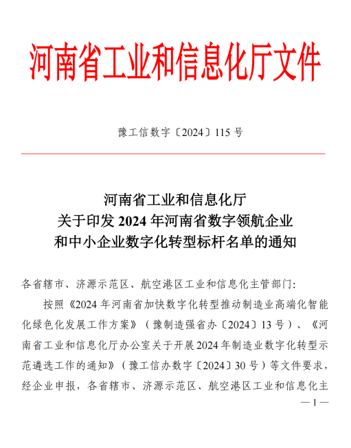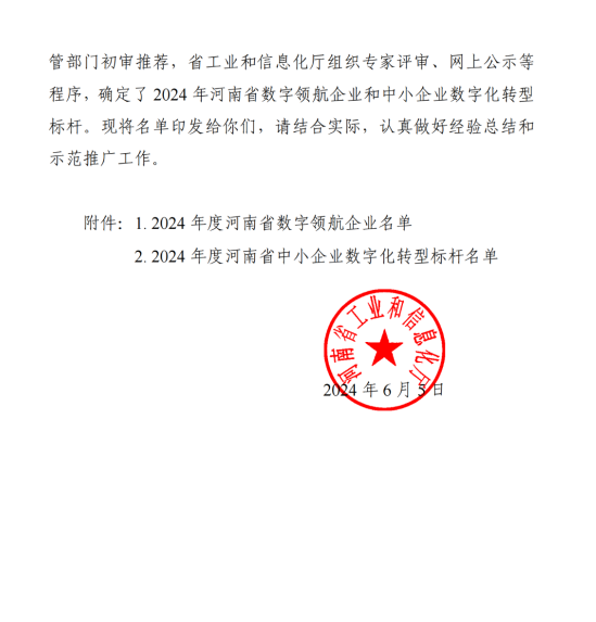 按照《2024年河南省加快數字化轉型推動制造業高端化智能化綠色化發展工作方案》(豫制造強省辦(2024)13號)、《河南省工業和信息化廳辦公室關于開展2024年制造業數字化轉型示范遴選工作的通知》(豫工信辦數字〔2024)30號〕等文件要求,經企業申報,各省轄市、濟源示范區、航空港區工業和信息化主管部門推薦,專家評審,亞澳農機被評為2024年河南省省級中小企業數字化轉型標桿企業。