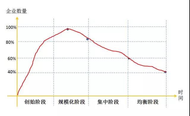 在一個行業,從長期看,企業要存活下來就要有超出平均水平的成本控制能力。管理學家陳春花認為一個行業內企業數量和時間軸之間的關系可以通過四個發展階段來說明:初創階段、規模化階段企業數量一直上升,規模化后期企業數量達到頂峰,開始有擠出效應,約20%企業出局,到集中階段又有20%企業出局,到均衡階段還要淘汰20%,最后的競爭就在剩下的40%企業之間展開。